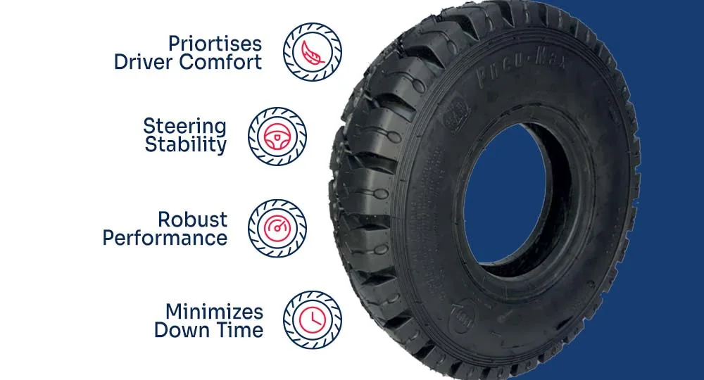 Pneu Max is especially designed to carry heavy loads under high operating speeds. Its superior construction ensures high service life with minimum downtime. The superior cushioning effect of Pneu Max ensures safety of the unit while offering extra comfort to the driver.